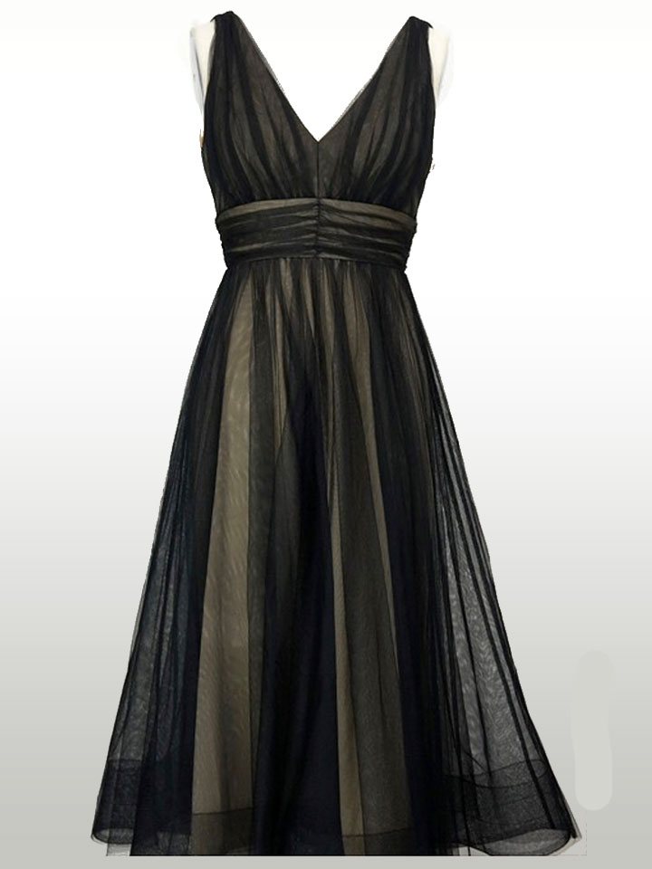 Black Nude Mesh Pleated Midi Dress