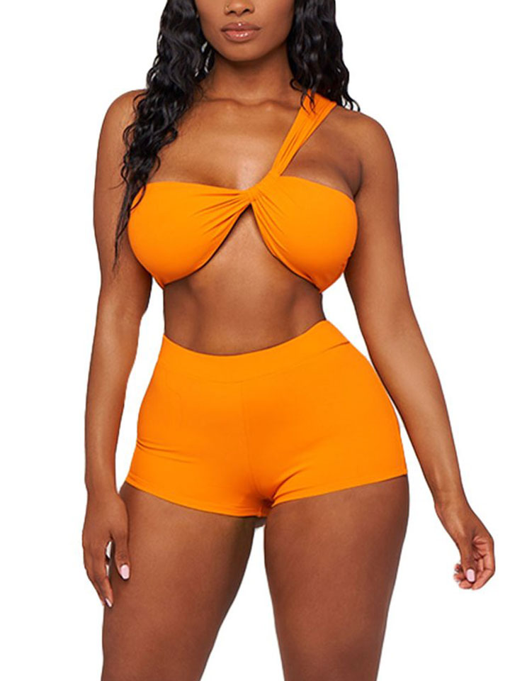 Orange two-piece featuring a one-shoulder neck design and boy short design bottoms